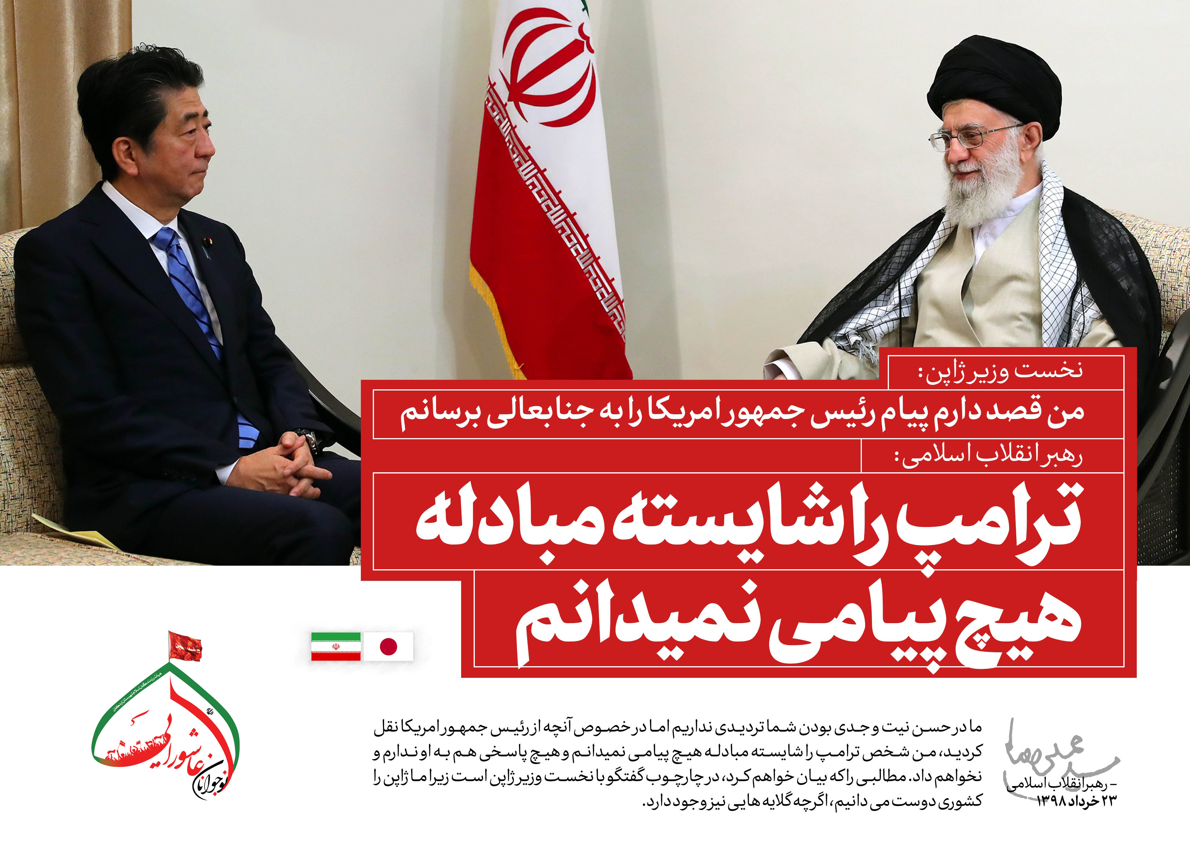 رهبر انقلاب اسلامی خطاب به نخستوزیر ژاپن گفتند: ما در حسننیت و جدی بودن شما تردیدی نداریم اما درخصوص آنچه از رئیسجمهور آمریکا نقل کردید، من شخص ترامپ را شایستهی مبادلهی هیچ پیامی نمیدانم و هیچ پاسخی هم به او ندارم و نخواهم داد.