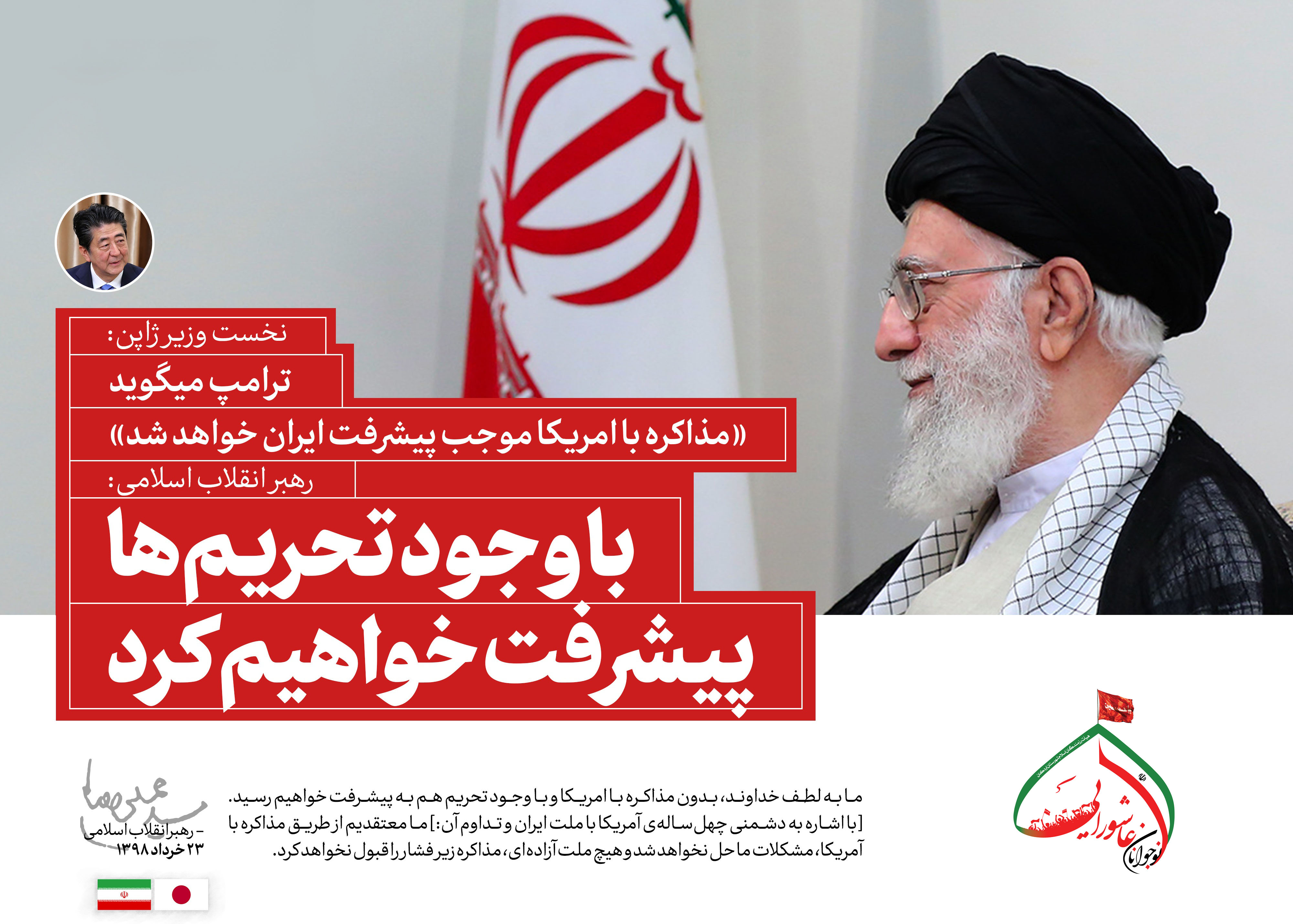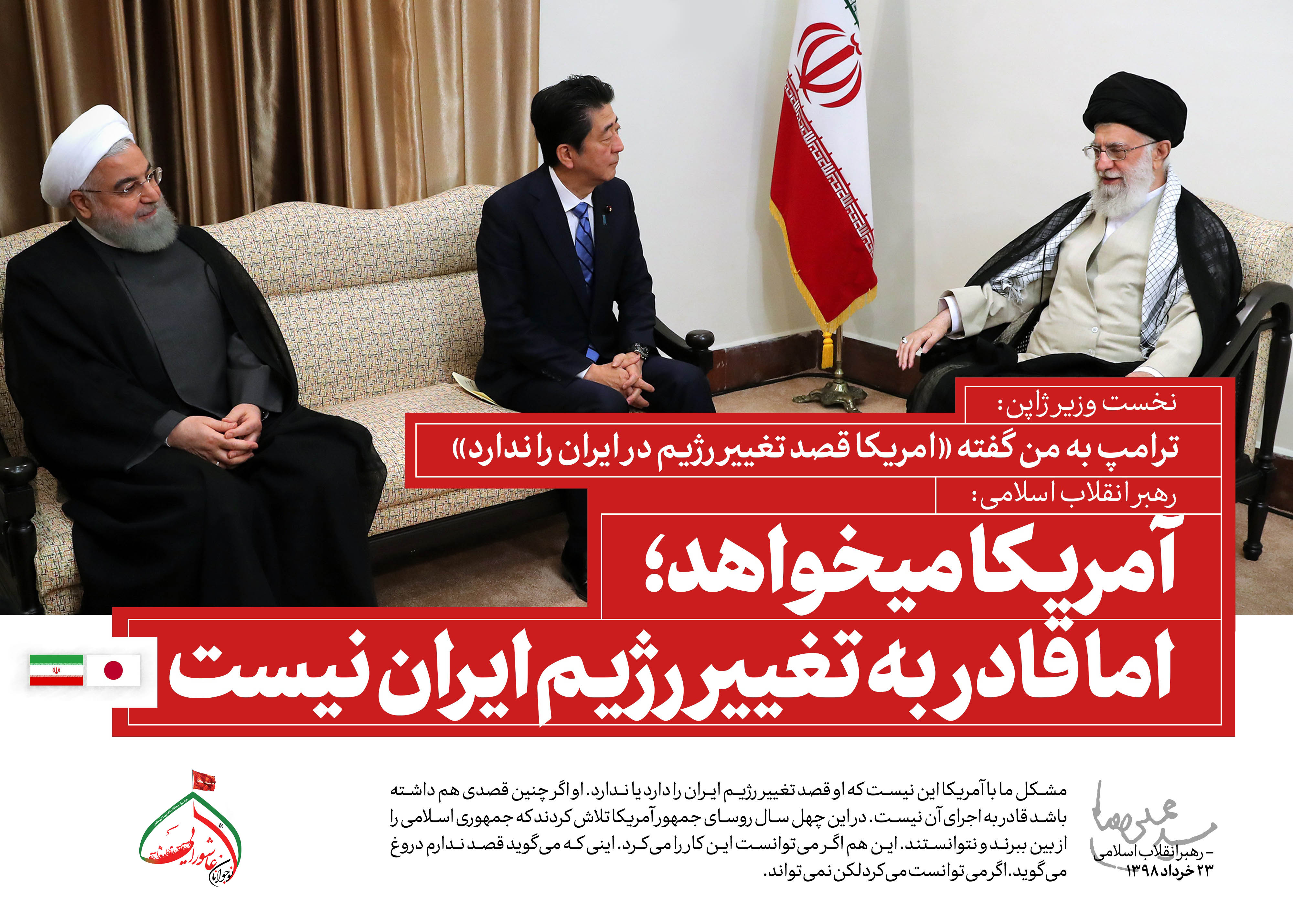 حضرت آیتالله خامنهای رهبر انقلاب اسلامی صبح امروز (پنجشنبه-1398/03/23) در دیدار با آقای شینزو آبه نخستوزیر ژاپن و هیئت همراه تأکید کردند: جمهوری اسلامی ایران هیچ اعتمادی به آمریکا ندارد و تجربهی تلخ مذاکرات قبلی با آمریکا در چارچوب برجام را بههیچوجه تکرار نخواهد کرد زیرا هیچ ملت آزاده و عاقلی، مذاکره تحت فشار را نمیپذیرد.