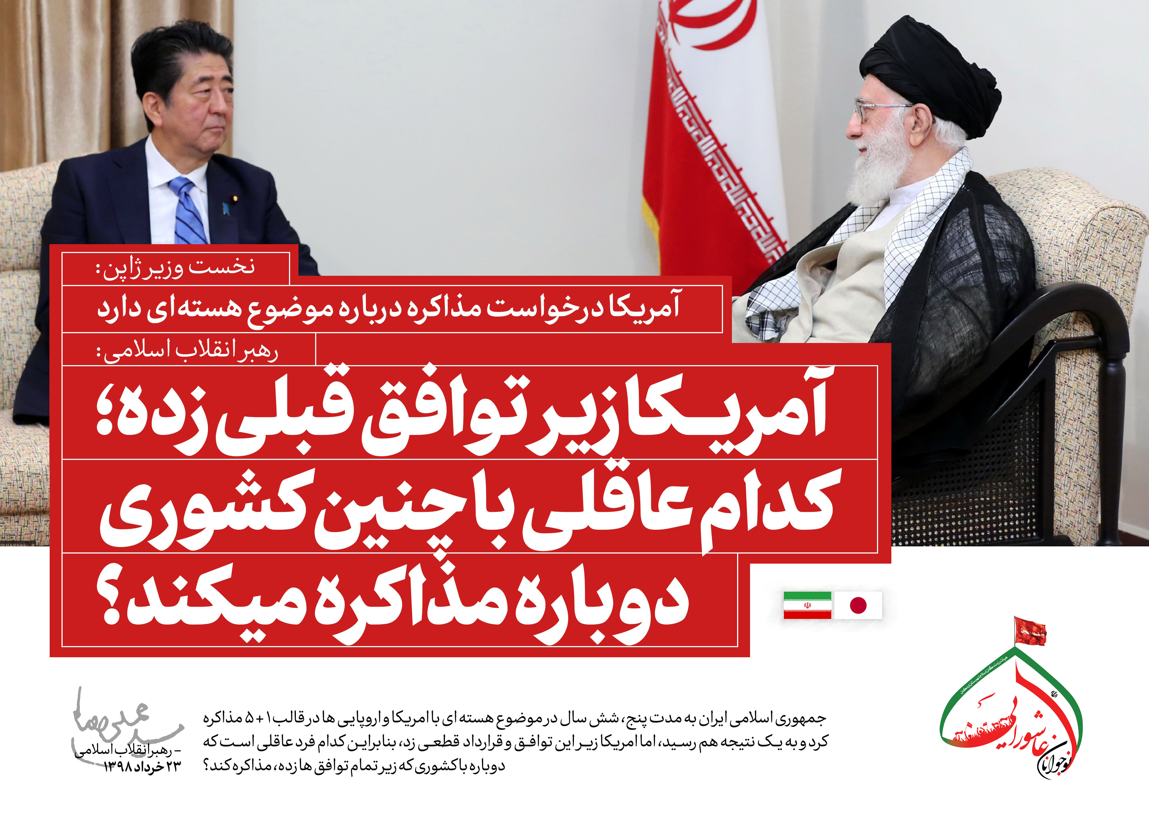حضرت آیتالله خامنهای با اشاره به صحبتهای نخستوزیر ژاپن مبنی بر درخواست آمریکا برای مذاکره دربارهی موضوع هستهای، گفتند: جمهوری اسلامی ایران به مدت پنج، شش سال در موضوع هستهای با آمریکا و اروپاییها در قالب ۱+۵ مذاکره کرد و به یک نتیجه هم رسید، اما آمریکا زیر این توافق و قرارداد قطعی زد، بنابراین کدام فرد عاقلی است که دوباره با کشوری که زیر تمام توافقها زده، مذاکره کند؟