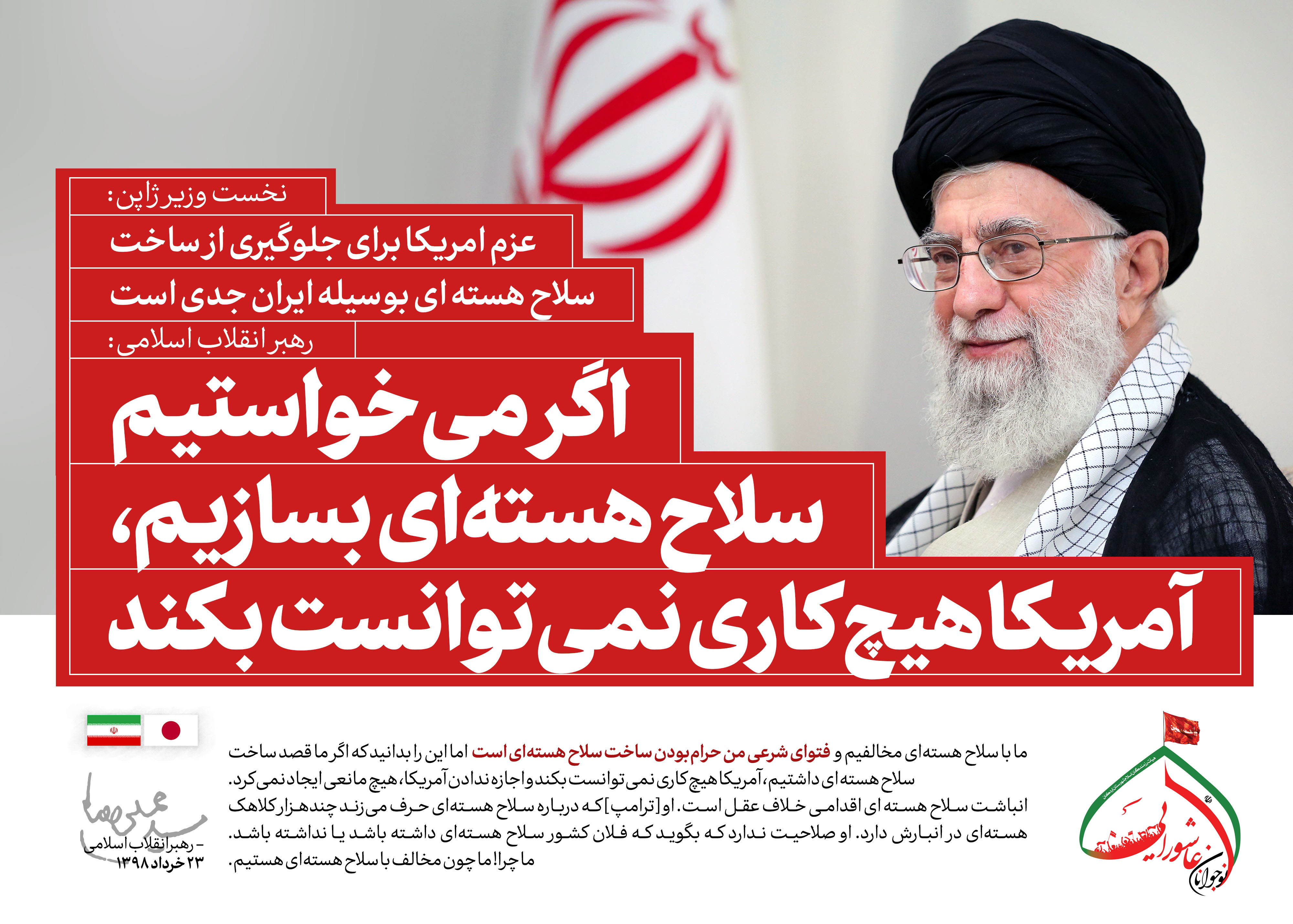 رهبر انقلاب اسلامی به بخش دیگری از صحبتهای نخستوزیر ژاپن مبنی بر عزم آمریکا برای جلوگیری از ساخت سلاح هستهای بهوسیلهی ایران اشاره کردند و افزودند: ما با سلاح هستهای مخالفیم و فتوای شرعی من حرام بودن ساخت سلاح هستهای است اما این را بدانید که اگر ما قصد ساخت سلاح هستهای داشتیم، آمریکا هیچ کاری نمیتوانست بکند و اجازه ندادن آمریکا، هیچ مانعی ایجاد نمیکرد.