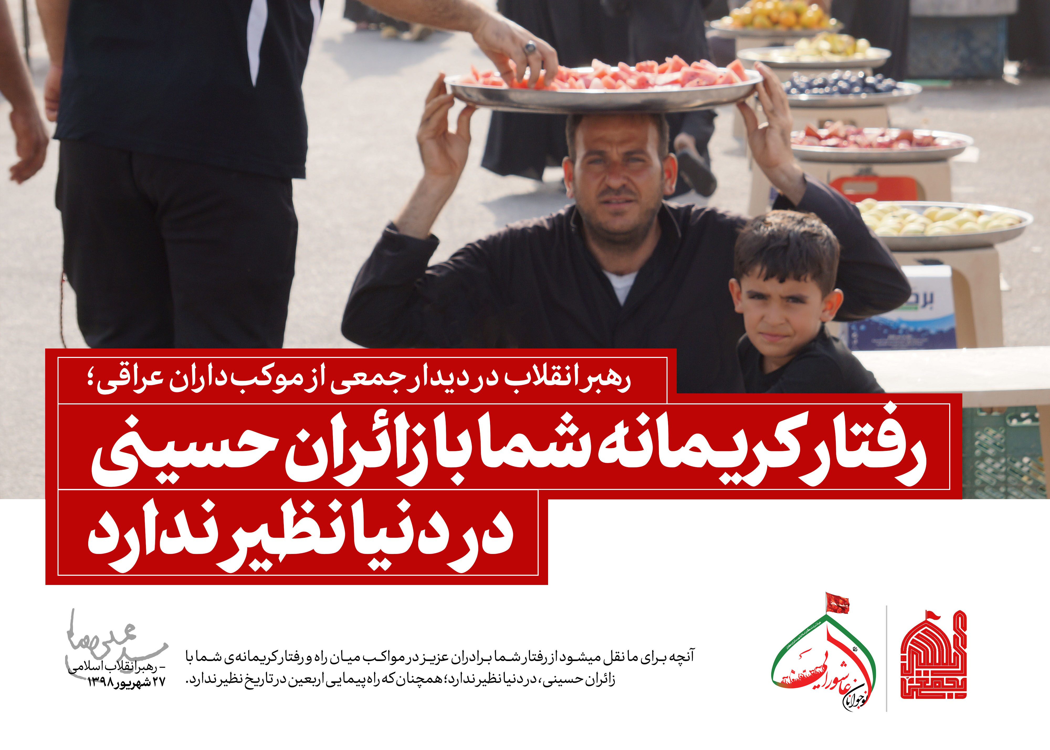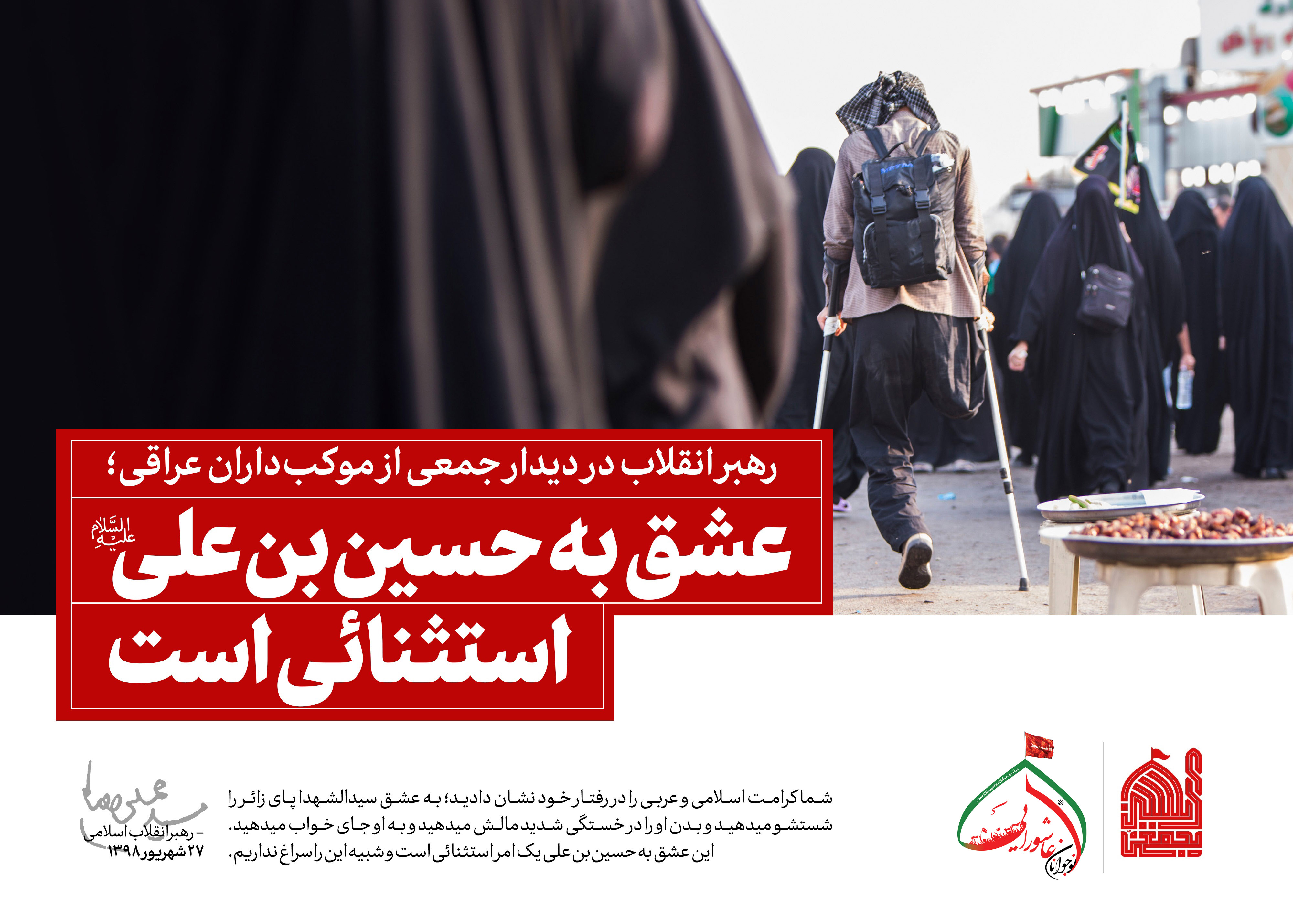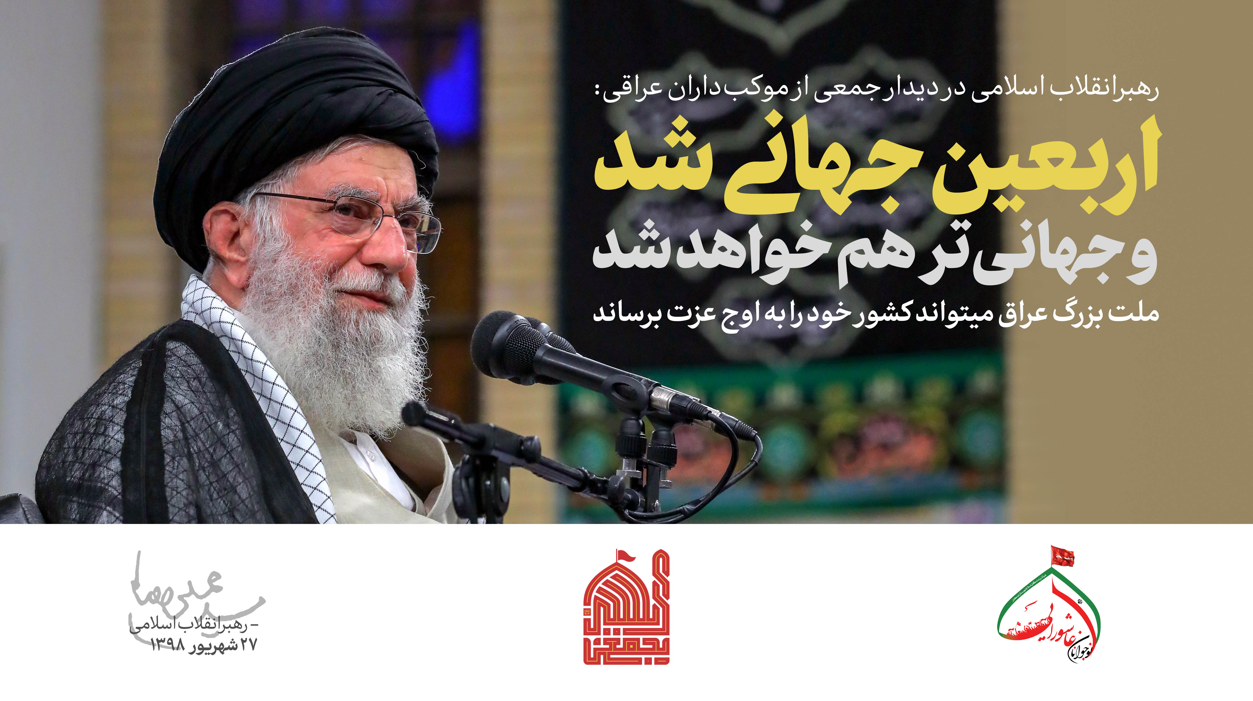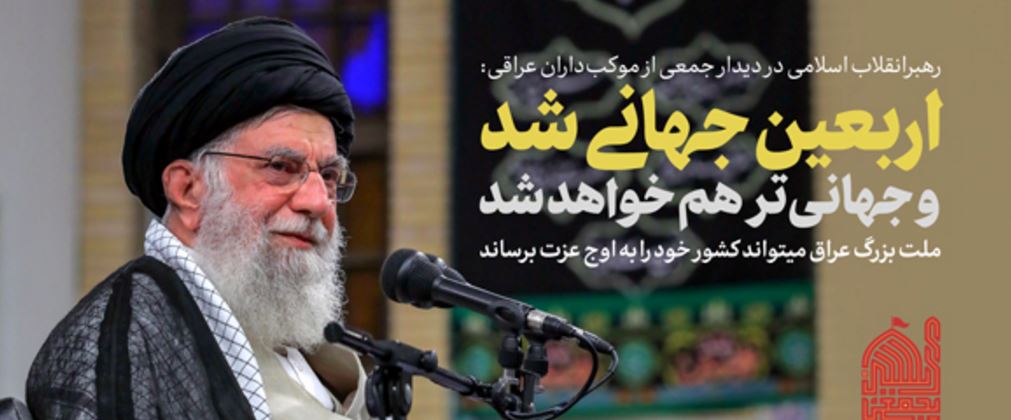حضرت آیتالله خامنهای رهبر معظم انقلاب اسلامی صبح امروز (چهارشنبه-1398/06/27) در مراسم تکریم و تقدیر از مهماننوازی موکبداران عراقی و خادمان راهپیمایی اربعین، ضمن تشکر صمیمانه از رفتار کریمانهی ملت بزرگ عراق، راهپیمایی اربعین را موضوعی بینظیر و جهانی، و زمینهساز گسترش معرفت حسینی و تشکیل تمدن نوین اسلامی خواندند و گفتند: راهپیمایی بزرگ اربعین، آیت عظمای الهی و نشانهی ارادهی پروردگار بر نصرت امت اسلامی است.
