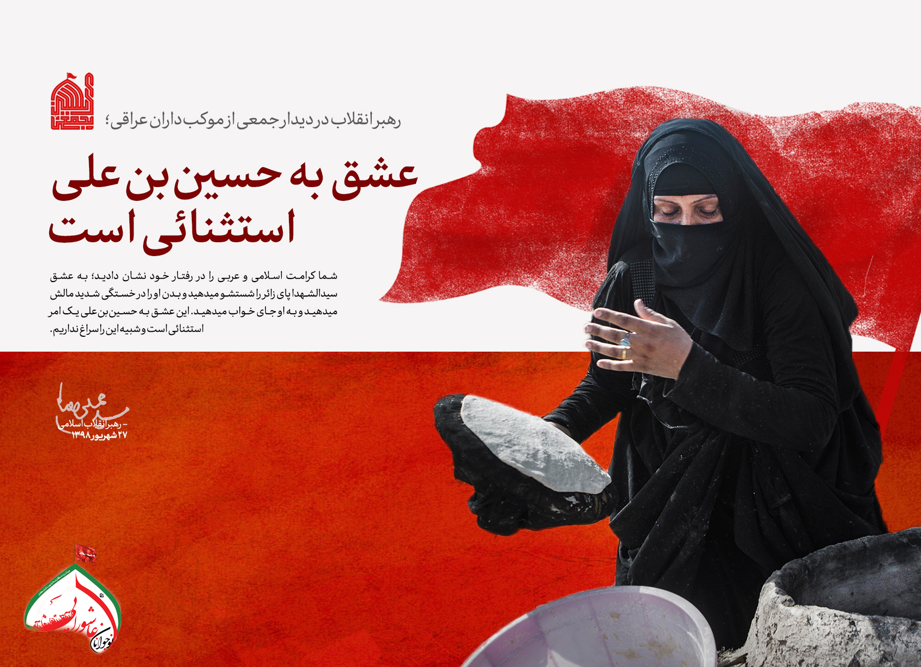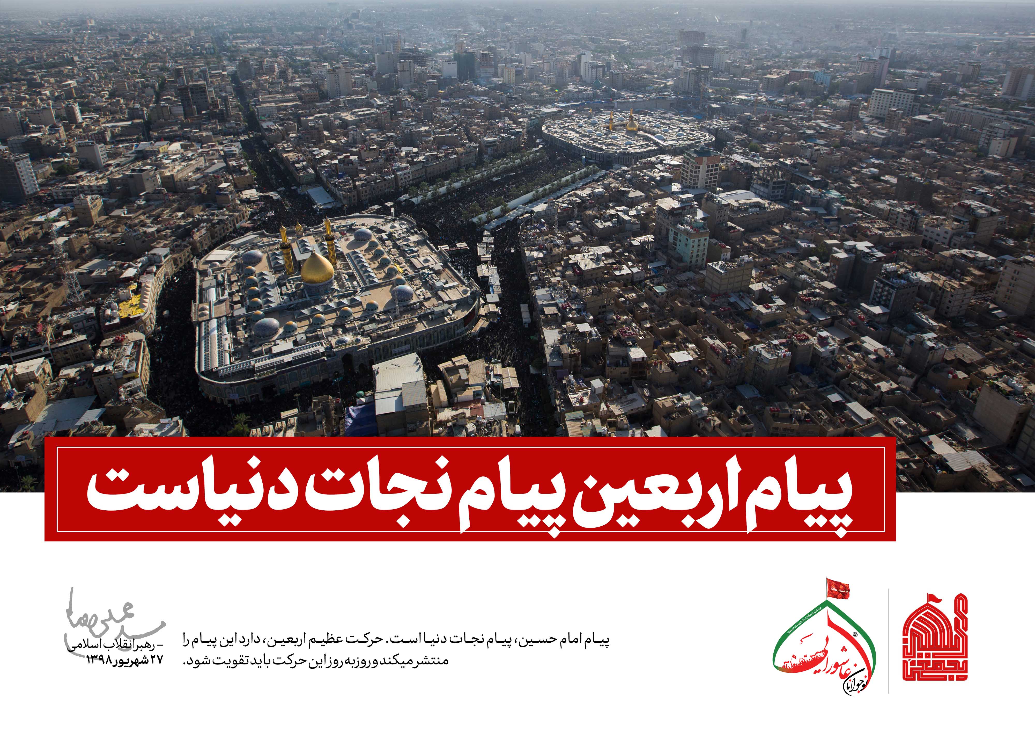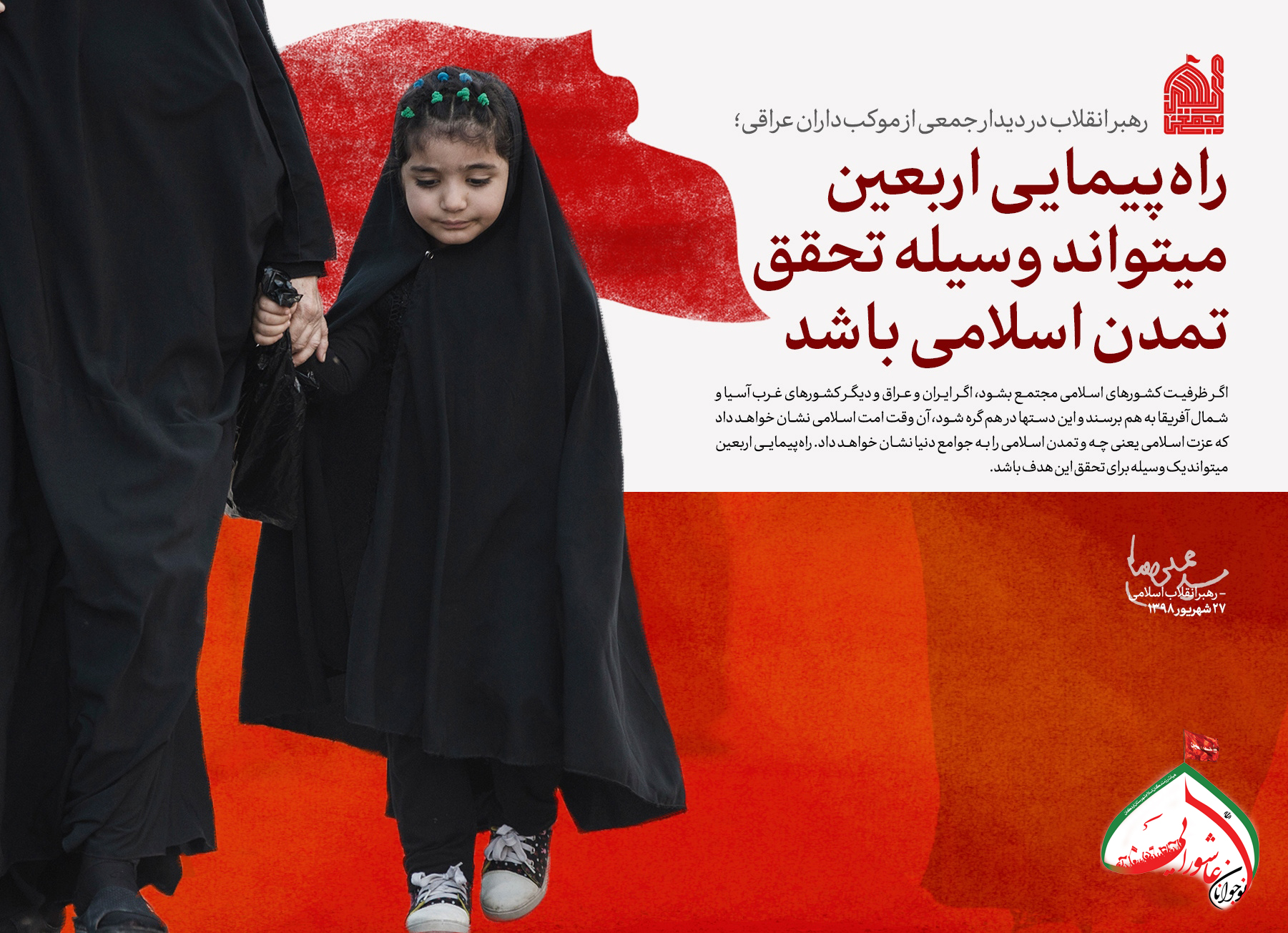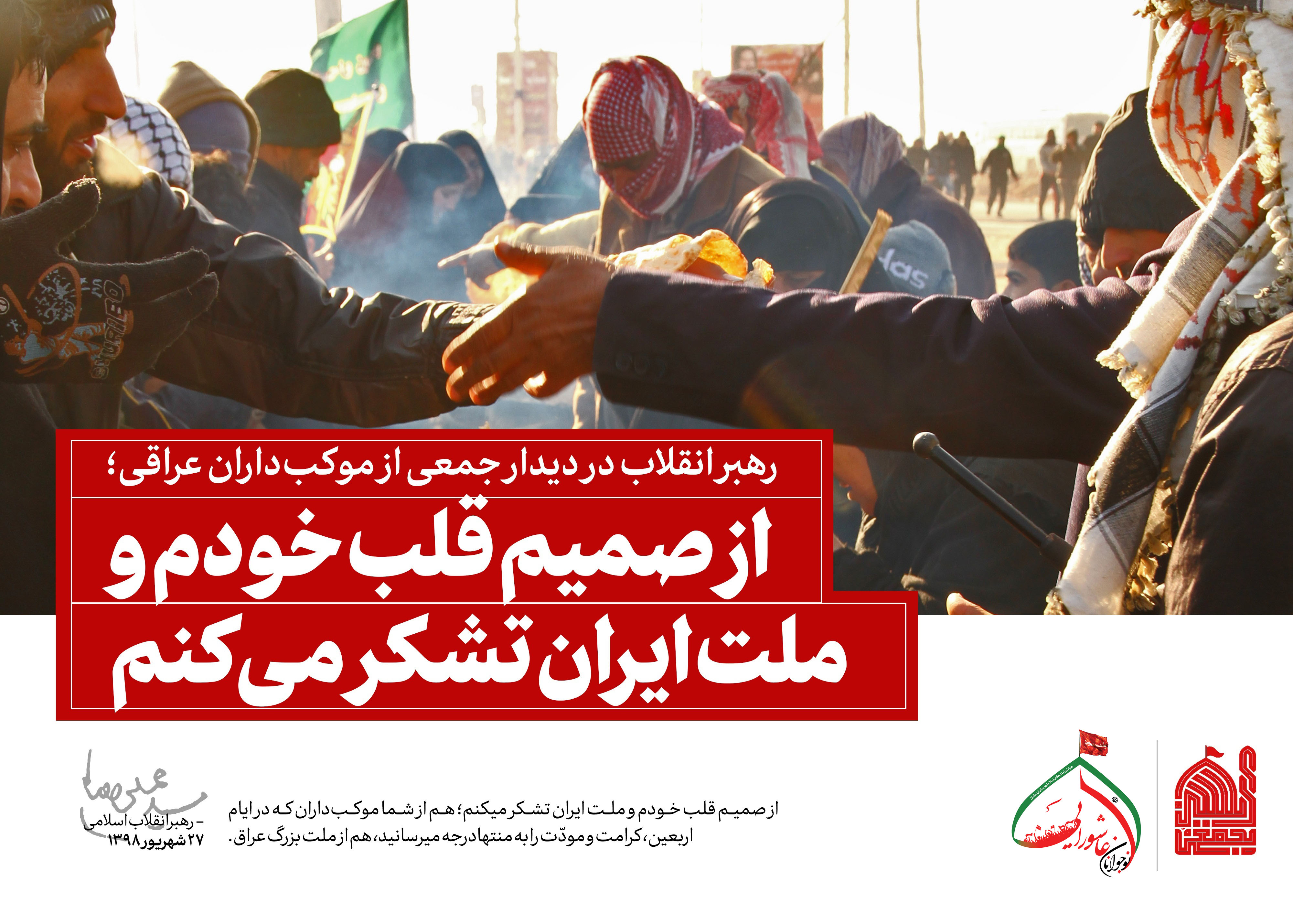 حضرت آیتالله خامنهای رهبر معظم انقلاب اسلامی صبح امروز (چهارشنبه-1398/06/27) در مراسم تکریم و تقدیر از مهماننوازی موکبداران عراقی و خادمان راهپیمایی اربعین، ضمن تشکر صمیمانه از رفتار کریمانهی ملت بزرگ عراق، راهپیمایی اربعین را موضوعی بینظیر و جهانی، و زمینهساز گسترش معرفت حسینی و تشکیل تمدن نوین اسلامی خواندند و گفتند: راهپیمایی بزرگ اربعین، آیت عظمای الهی و نشانهی ارادهی پروردگار بر نصرت امت اسلامی است.