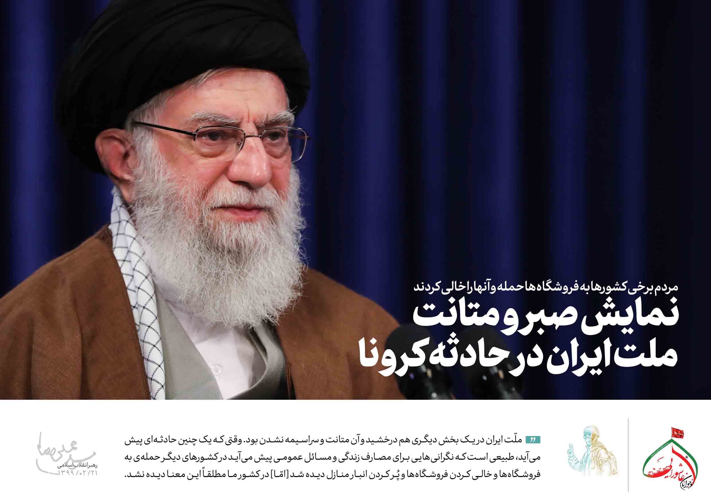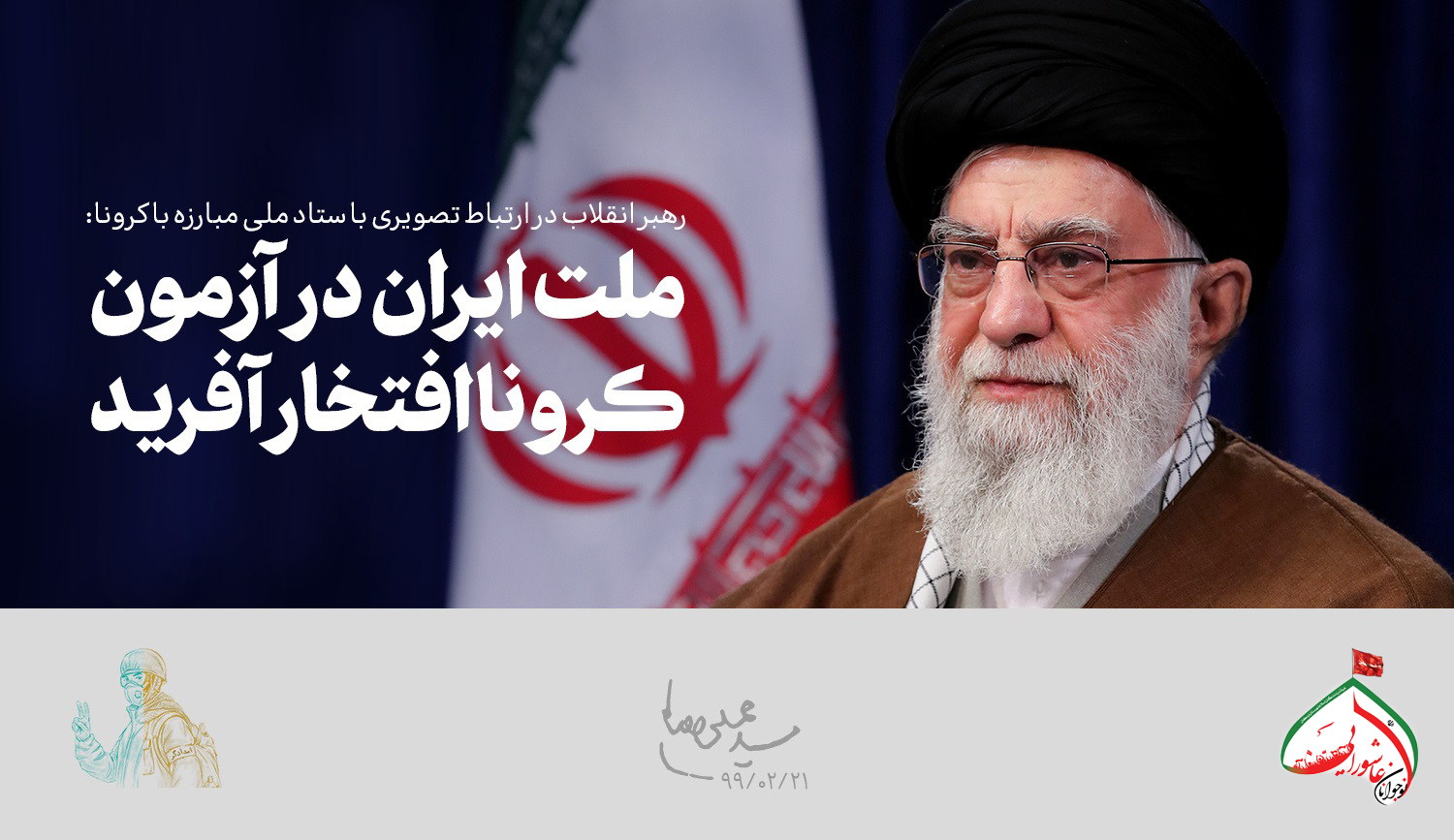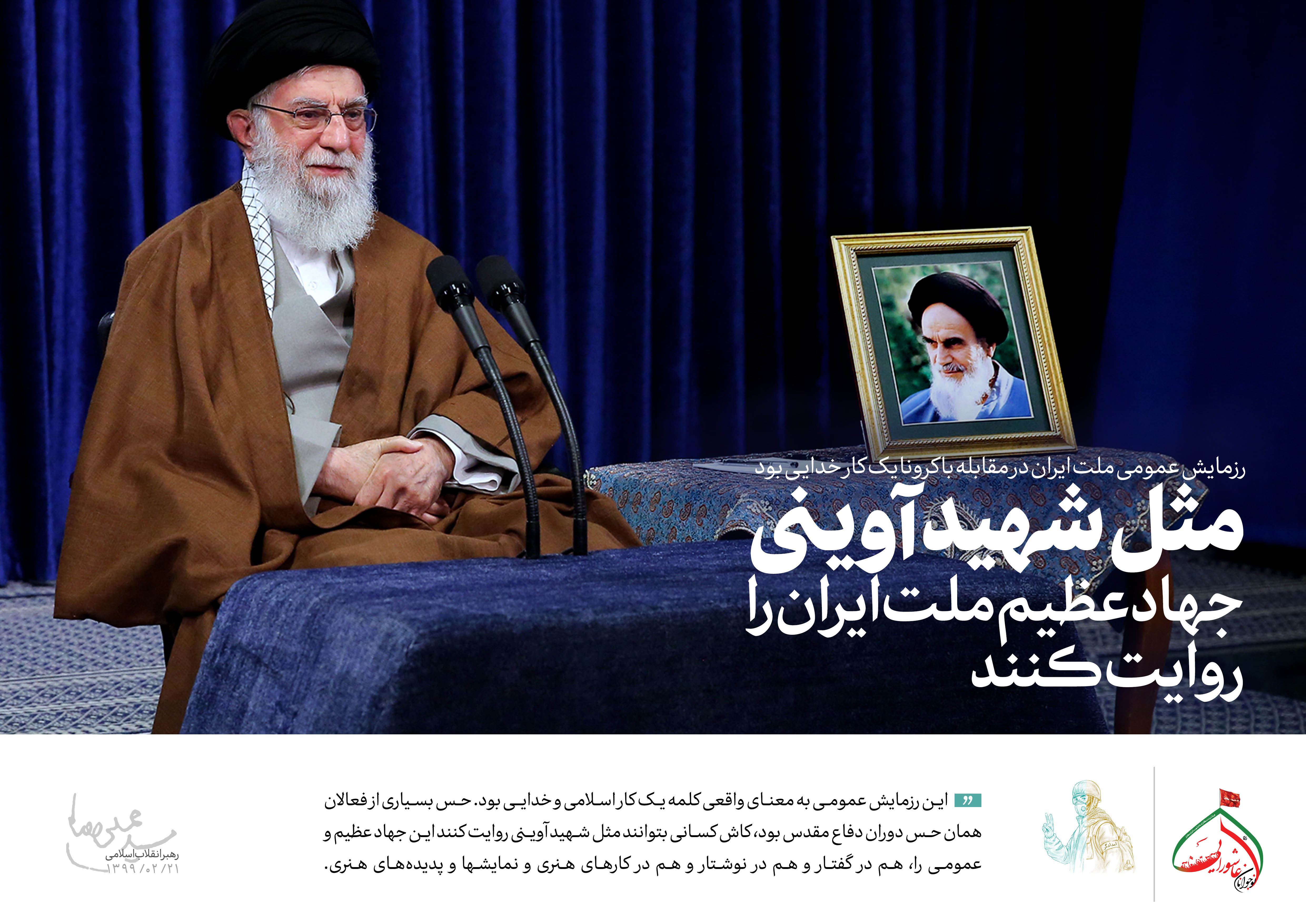 حضرت آیتالله خامنهای رهبر معظم انقلاب اسلامی صبح امروز (یکشنبه-۱۳۹۹/۰۲/۲۱) در ارتباط تصویری با ستاد ملی مبارزه با کرونا که با حضور اعضای این ستاد و استانداران ۳۱ استان کشور برگزار شد، عملکرد ملت و مسئولان را در این زمینه در ابعاد مختلف اجتماعی ـ فرهنگی، درمانی، بهداشتی، علمی، مدیریتی و خدماتی «حرکتی جهادی، عظیم و افتخارآمیز» خواندند و با تأکید بر ثبت، بازخوانی و روایت هنرمندانهی این تلاش و فداکاری ملی افزودند: مردم عزیز ایران با رفتار متین و صبورانهی خود انصافاً خوش درخشیدند و فرهنگ اسلامی ـ ایرانی را جلوهگر ساختند.