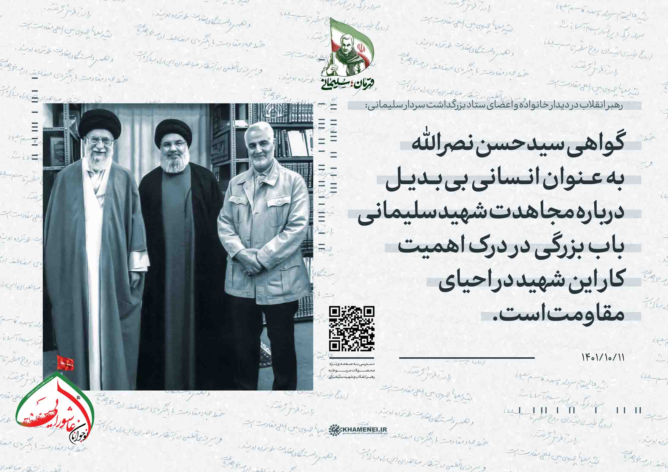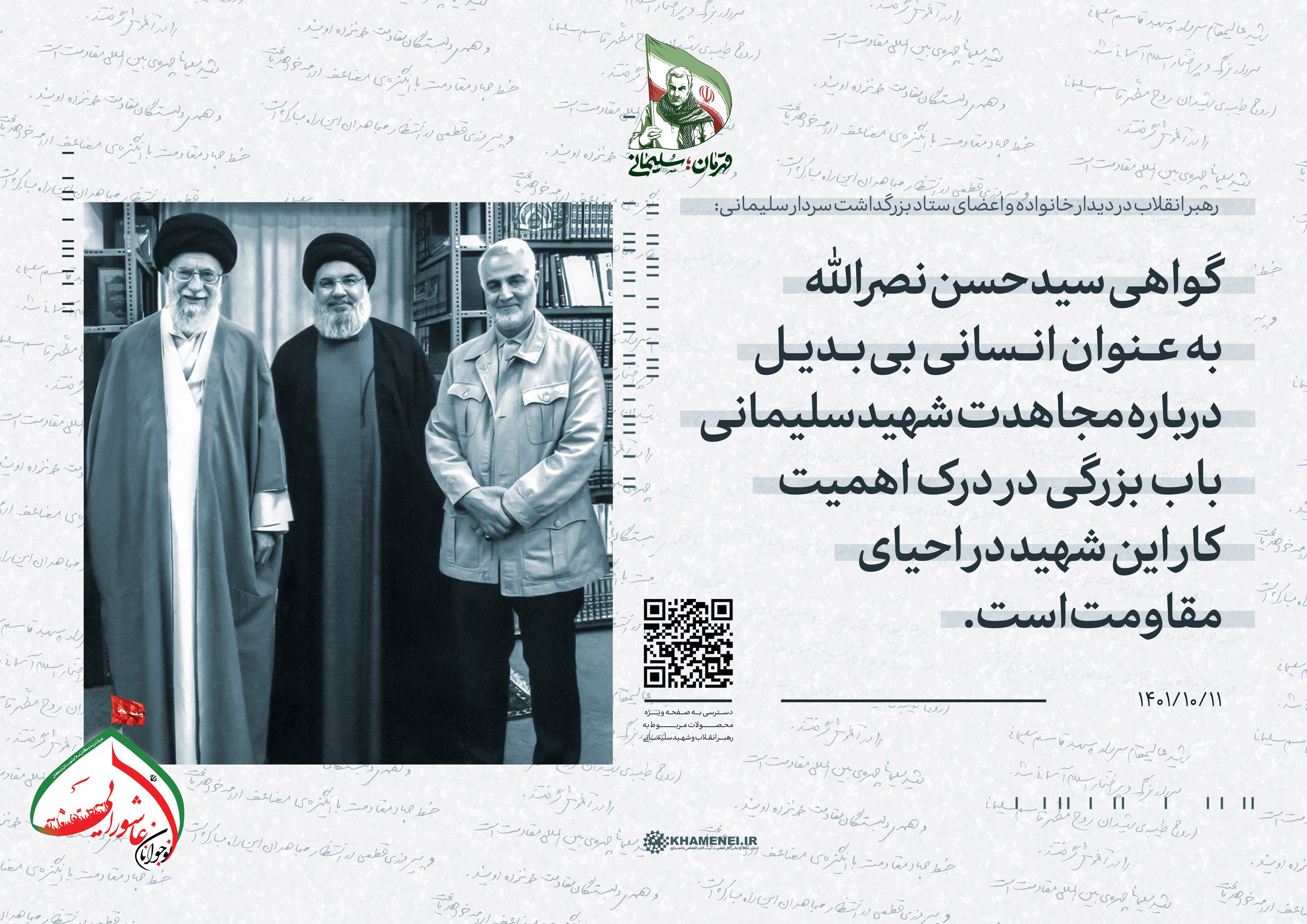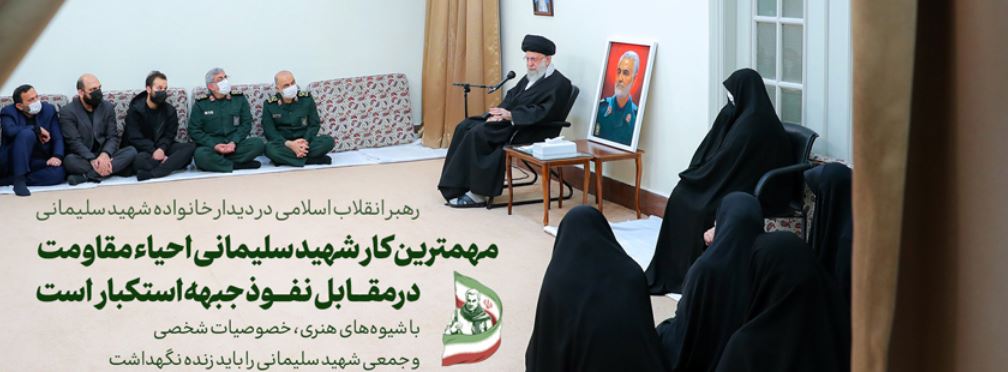 ۱۴۰۱/۱۰/۱۱) در دیدار خانواده و اعضای ستاد بزرگداشت سردار سلیمانی، دمیدن روحی تازه به جبهه مقاومت را کار بسیار برجسته و اساسی شهید سلیمانی خواندند و افزودند: سردار با تقویت مادی، معنوی و روحی مقاومت، این پدیده ماندگار و رشد یابنده را در مقابل رژیم صهیونیستی و نفوذ امریکا و دیگر کشورهای استکباری حفظ، مجهز و احیاء کرد.