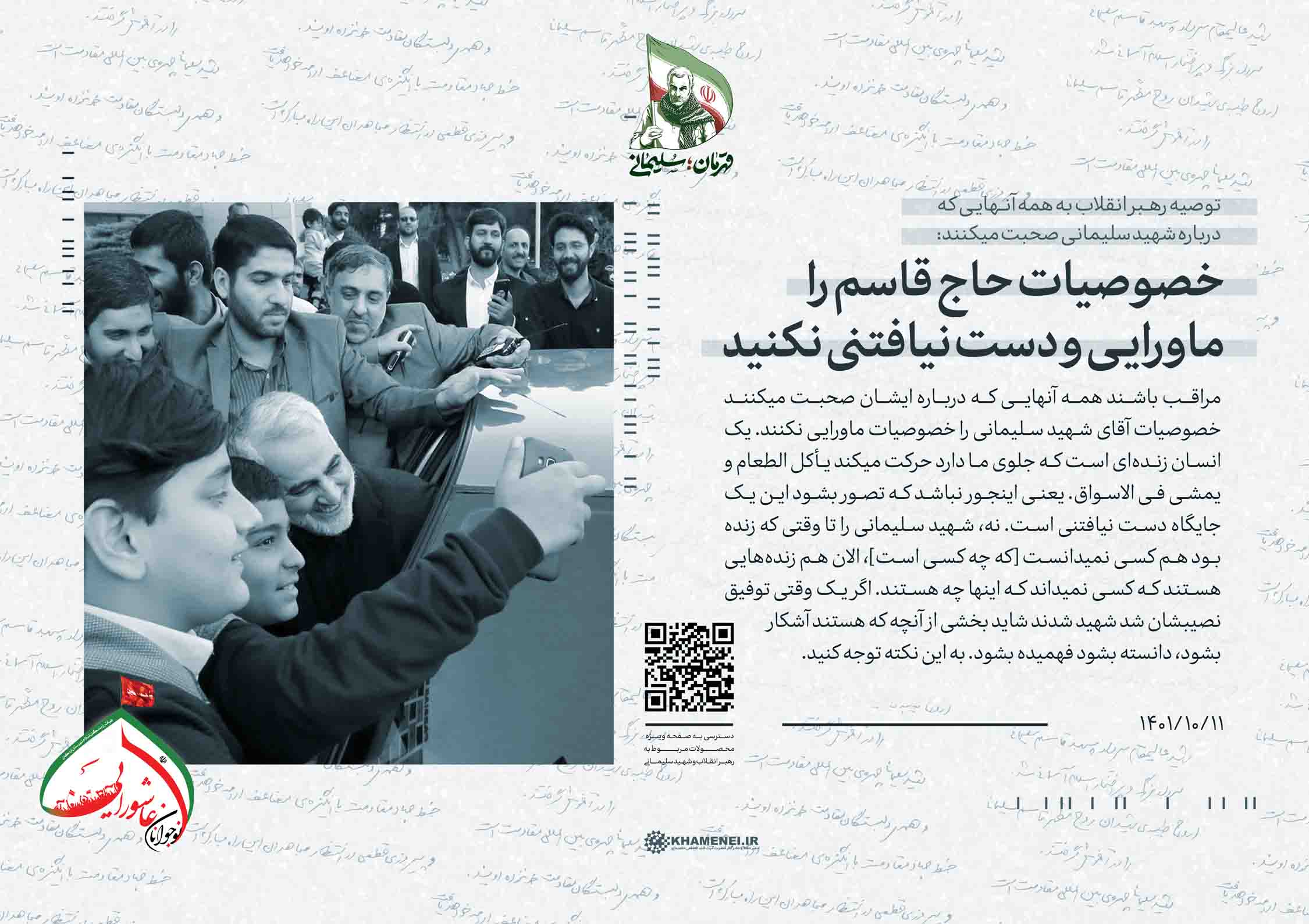 حضرت آیتالله خامنهای با تأکید بر لزوم زنده نگه داشتن یاد همه شهیدان که سردار سلیمانی از برجسته ترین آنها است افزودند: باید با استفاده از انواع هنرها بگونه ای یاد شهید و خصوصیات فردی و کاری او را زنده نگه داریم و تبیین کنیم که حضور مردمی در تجلیل از او همیشگی و مستمر باشد.
