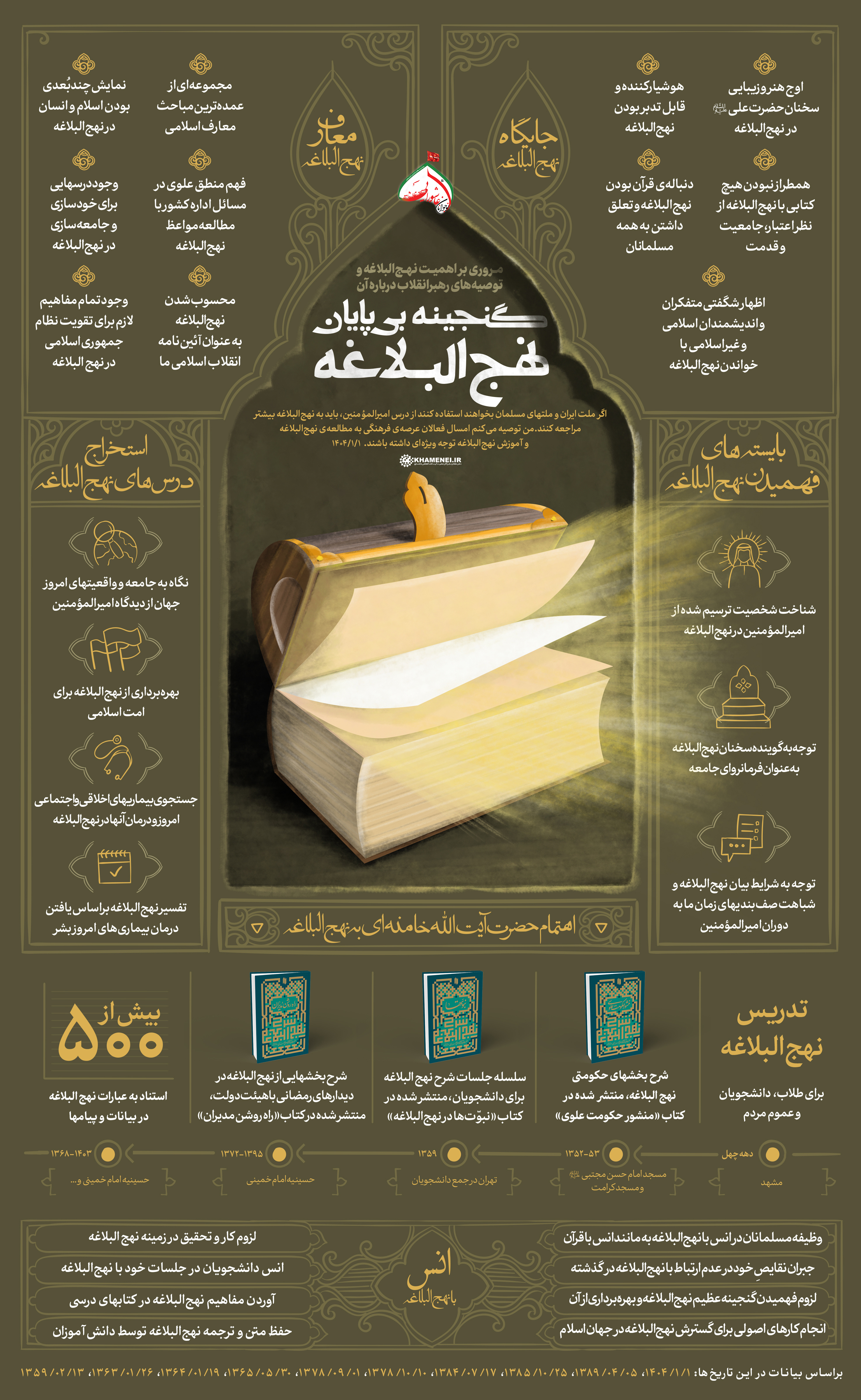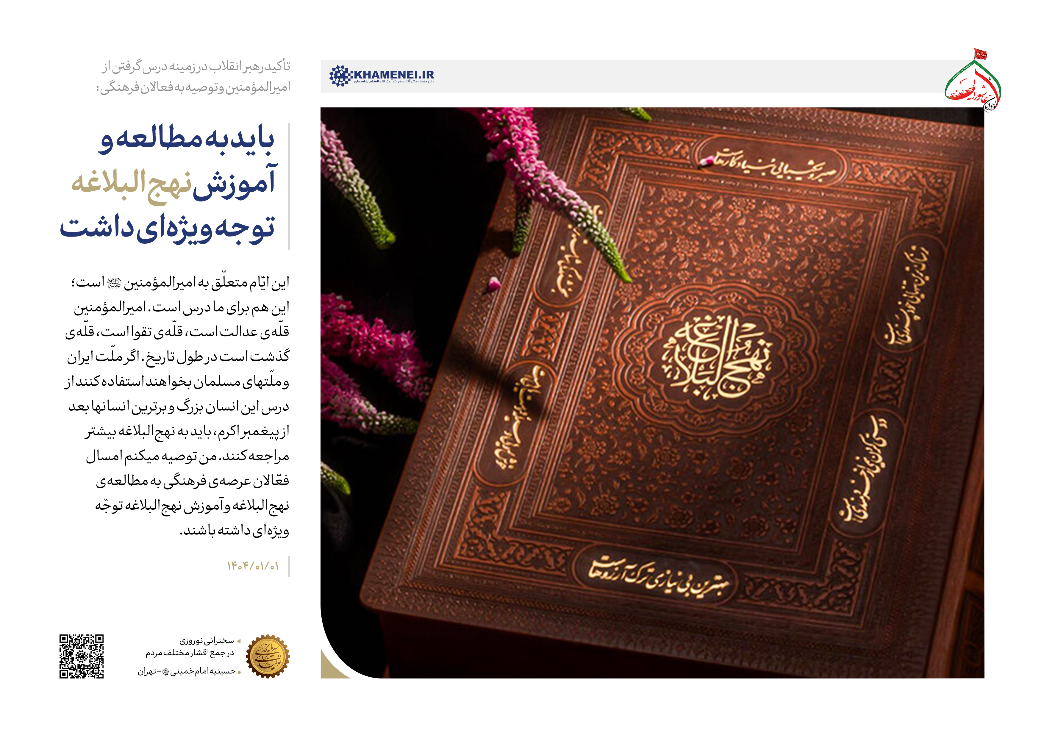 این ایّام متعلّق به امیرالمؤمنین (علیه الصّلاة و السّلام) است؛ این هم برای ما درس است. امیرالمؤمنین قلّهی عدالت است، قلّهی تقوا است، قلّهی گذشت است در طول تاریخ. اگر ملّت ایران و ملّتهای مسلمان بخواهند استفاده کنند از درس این انسان بزرگ و برترین انسانها بعد از پیغمبر اکرم، باید به نهجالبلاغه بیشتر مراجعه کنند. من توصیه میکنم امسال فعّالان عرصهی فرهنگی به مطالعهی نهجالبلاغه و آموزش نهجالبلاغه توجّه ویژهای داشته باشند.