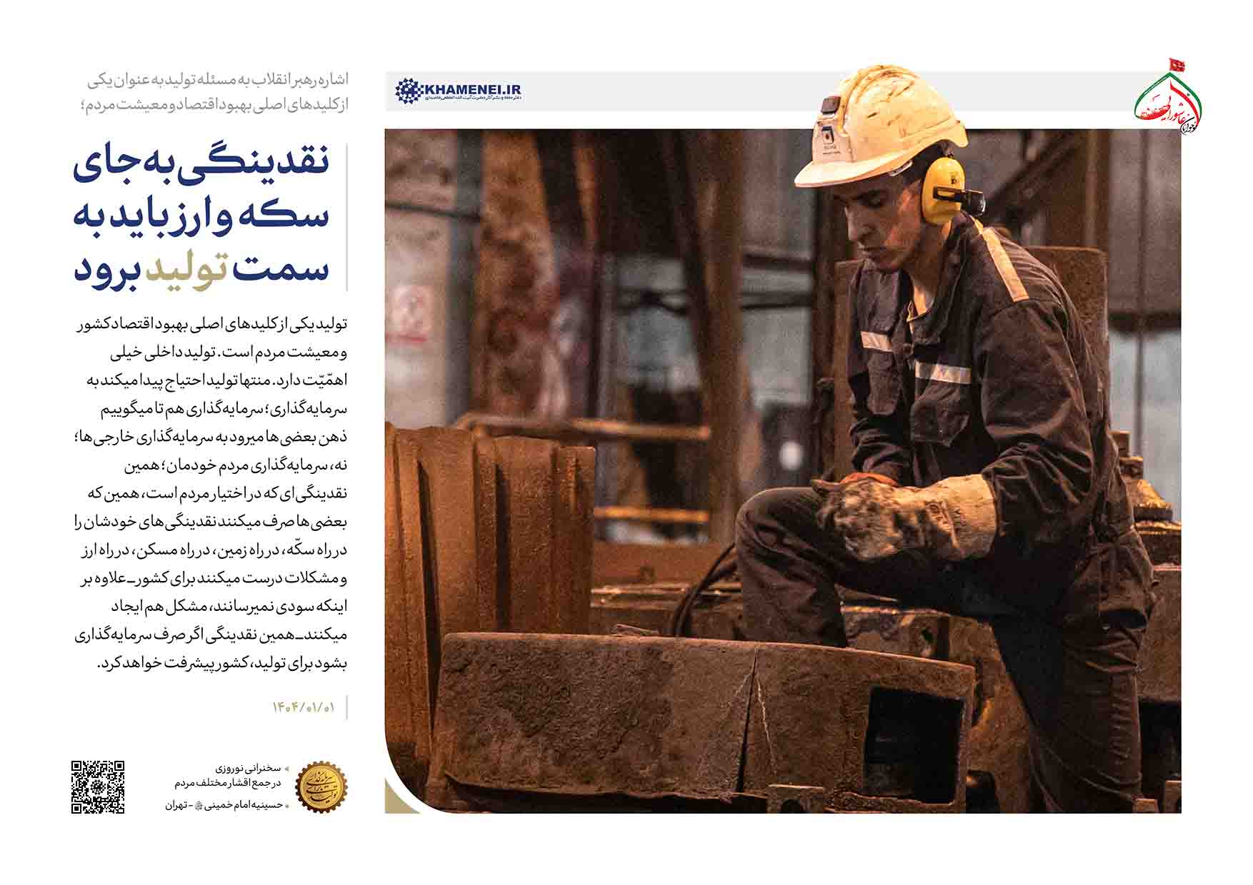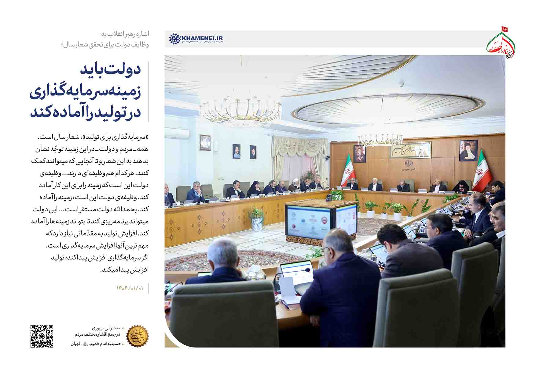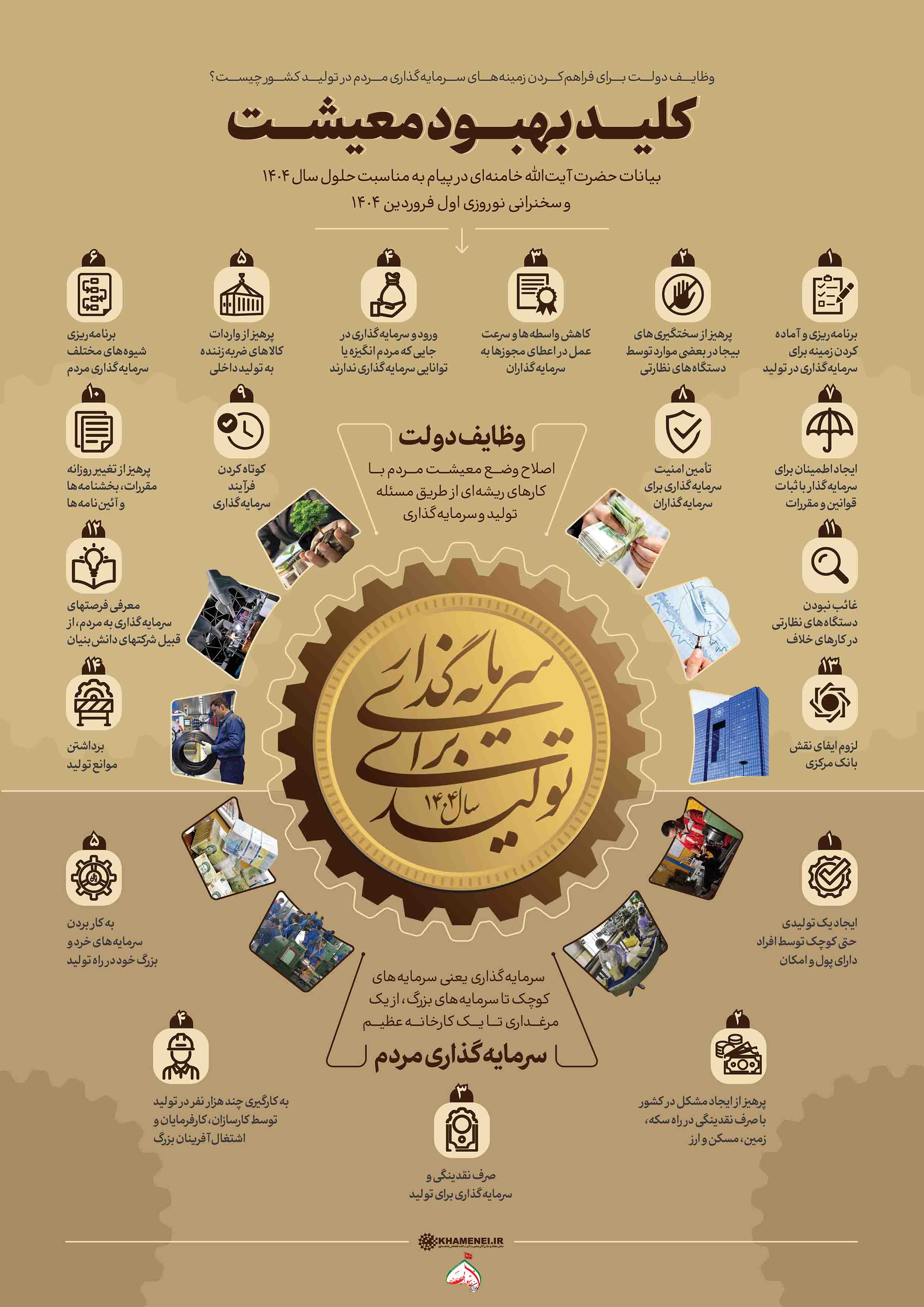 حضرت آیتالله خامنهای علت توجه مکرر به مقوله تولید در شعار سالهای اخیر را تأثیر اساسی تولید در بهبود اوضاع اقتصادی کشور و معیشت مردم برشمردند و به تبیین وظایف مردم و سه قوه -بویژه دولت- برای تحقق شعار سال نو یعنی «سرمایهگذاری برای تولید» پرداختند.