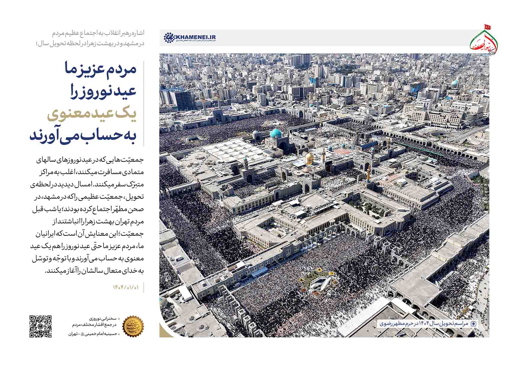 رهبر معظم انقلاب اسلامی در اولین روز سال نو در دیدار با هزاران نفر از قشرهای مختلف مردم، سنت ایرانیان مبنی بر آغاز سال نو با دعا و توسل و اجتماع در مراکز متبرک را نشانه نگاه معنوی ملت به عید نوروز خواندند و با تبیین آثار دعا و استقامت در پیروزیهای بزرگ جبهه حق در طول تاریخ، سال گذشته را سال صبوری، ایستادگی و بروز قدرت معنوی مردم ایران برشمردند و با آرزوی سالی مبارک برای همه ملت، وظایف مردم و دولت را در تحقق شعار سال یعنی «سرمایهگذاری برای تولید» و بهبود اوضاع اقتصادی و معیشتی تبیین کردند.