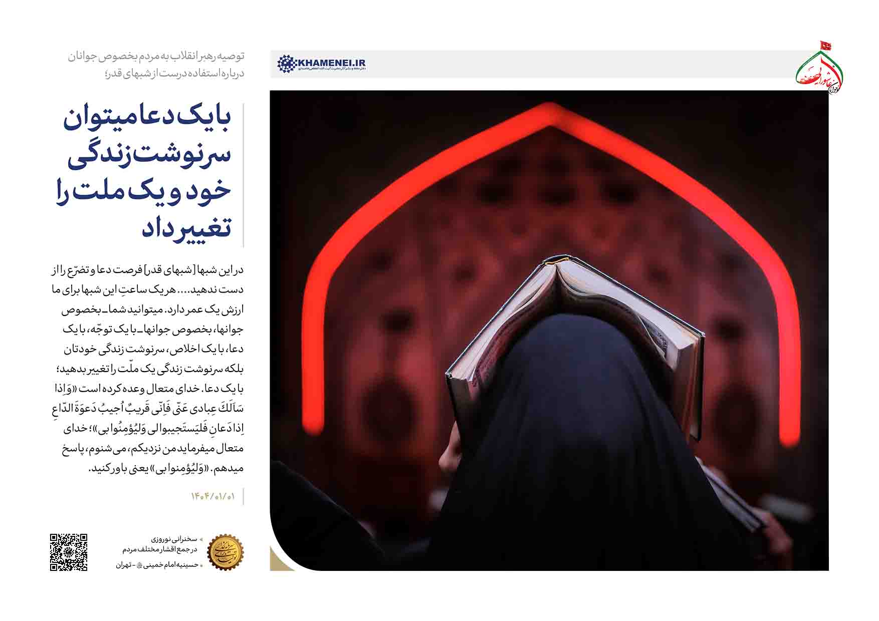 پروردگارا! در این روز اوّل سال تفضّلات و لطف خودت را بر این ملّت نازل کن. پروردگارا! این سال را برای ملّت ایران، برای ملّتهای مسلمان، سال مبارکی قرار بده؛ ملّتهای مظلوم را بر ظَلَمه فائق و پیروز بگردان. پروردگارا! به محمّد و آل محمّد، ما را بیامرز؛ ملّت ایران را به اهداف بزرگ خودش برسان؛ قلب مقدّس ولیّعصر را از ما راضی کن؛ روح مطهّر امام بزرگوار که این راه را ایشان روی ما باز کرد و روح مطهّر شهدای عزیز که یاری کردند امام بزرگوار را، راضی و خشنود بگردان؛ رحمت و مرحمت خودت را بر اینها نازل کن.