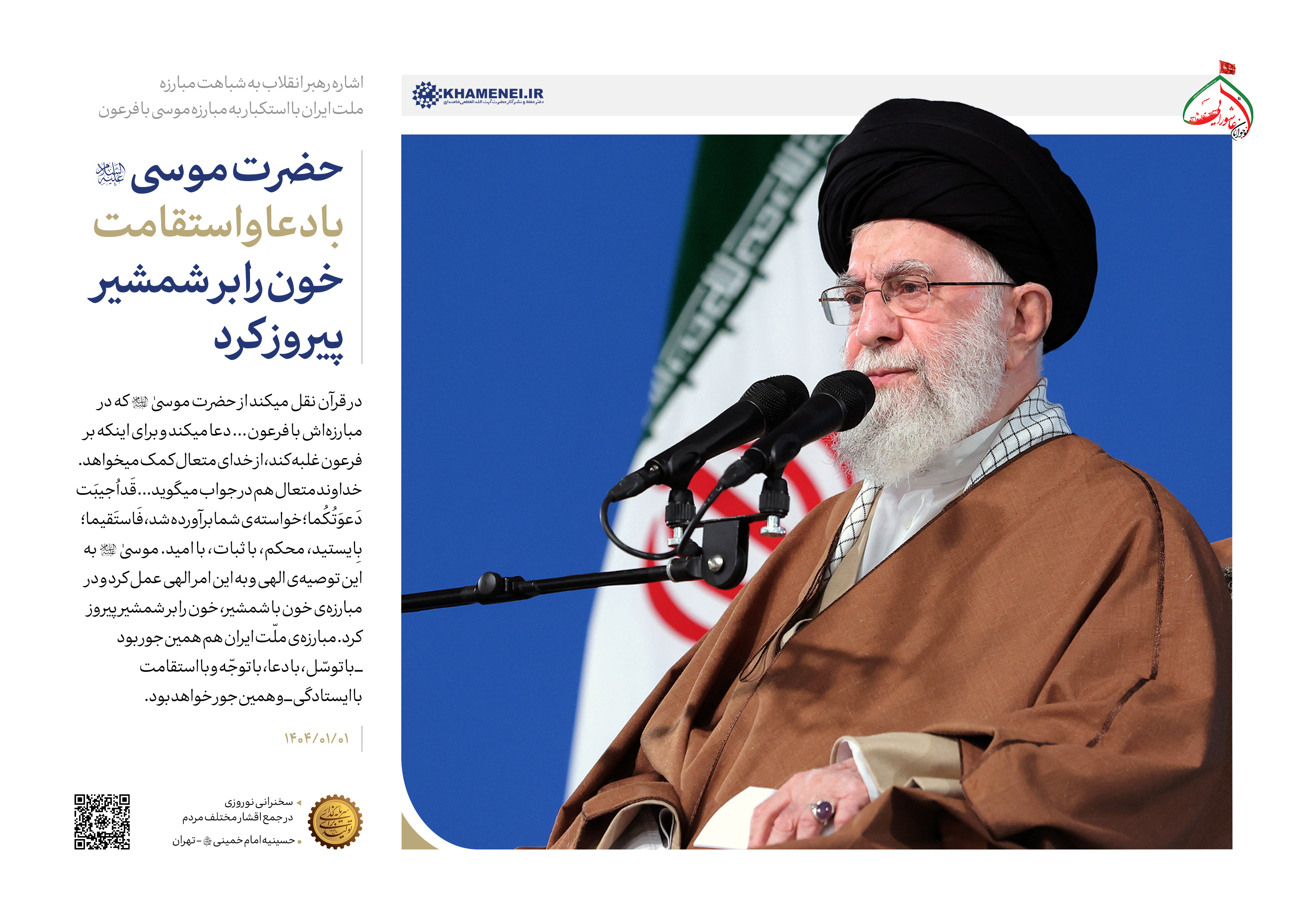 البتّه جبههی حق در این مبارزات هزینه هم میدهد. من مایلم تأکید کنم بر این مطلب؛ به حوادث سال ۱۴۰۳ ــ سال گذشته ــ با این چشم نگاه کنید. در مبارزهی حق و باطل، پیروزی با حق است امّا جبههی حق هزینه میدهد. در جنگ هشتساله در دفاع مقدّس، یک طرف ما بودیم، طرف مقابل یک ائتلاف جهانی بود پشت سر صدّام! هشت سال جنگ طول کشید، بعد از هشت سال همهی دنیا قبول کردند که ایران ــ ایران تنها و تهیدست ــ بر طرف مقابل پیروز شد؛ این را همه فهمیدند، این را همه گفتند، این را همه تصدیق کردند، امّا خب ما در این پیروزی همّتها از دست دادیم، باکریها از دست دادیم، خرّازیها از دست دادیم، چمرانها از دست دادیم؛ اینها خسارت است، اینها هزینه دادن است، لکن در راه پیروزی نهایی است. در حوادث سال گذشته، شخصیّتهای بزرگی از دست ما رفتند؛ شخصیّتهای ارزندهی ایرانی و لبنانی از دست ما رفتند؛ اینها مصیبت بود برای ما، مثل قضیّهی موسیٰ؛ آنجا هم همینجور. حضرت موسیٰ وقتی به مصر آمد، یک زندگی آرام و راحتی که نداشت؛ خودش و بنیاسرائیل در نهایت شدّت بودند: قالوا اوذینا مِن قَبلِ اَن تَأتیَنا وَ مِن بَعدِ ما جِئتَنا؛(۵) بنیاسرائیل به موسیٰ میگفتند که قبل از اینکه شما بیایی به عنوان پیغمبر در مقابل فرعون بِایستی، ما زیر شکنجه بودیم، حالا هم که آمدی باز زیر شکنجهایم! حضرت موسیٰ به آنها فرمود: قالَ موسىٰ لِقَومِهِ استَعینوا بِاللهِ وَ اصبِروا؛(۶) استعانت کنید، از خدای متعال کمک بخواهید، صبر کنید، استقامت کنید، مسائل درست خواهد شد؛ و درست شد. همانهایی که گله میکردند که داریم شکنجه میشویم، جلوی چشم خودشان دیدند که فرعون و فرعونیان با ذلّت تمام در آب غرق شدند، نابود شدند و اثری از قدرت و سلطنتشان باقی نماند؛ فقط اجسامشان باقی ماند جلوی چشم، برای عبرت. به این چشم نگاه کنید به حوادثی که پیش میآید، به سختیها، به دشواریها. نهفقط در زمینهی مبارزه؛ ما سال گذشته ــ سال ۱۴۰۳ ــ حوادث تلخ طبیعی هم داشتیم. در طبس در یک معدن، بیش از پنجاه نفر جان باختند؛(۷) خب اینها حادثههای تلخی است. جواب حضرت موسیٰ این است: اِستَعینوا بِاللهِ وَ اصبِروا؛ از خدای متعال استعانت کنید، کمک بخواهید و صبر کنید. شک نکنید سرانجام این ایستادگیها، شکست دشمنان است، شکست رژیم خبیث فاسدِ فاسق صهیونیستی است.