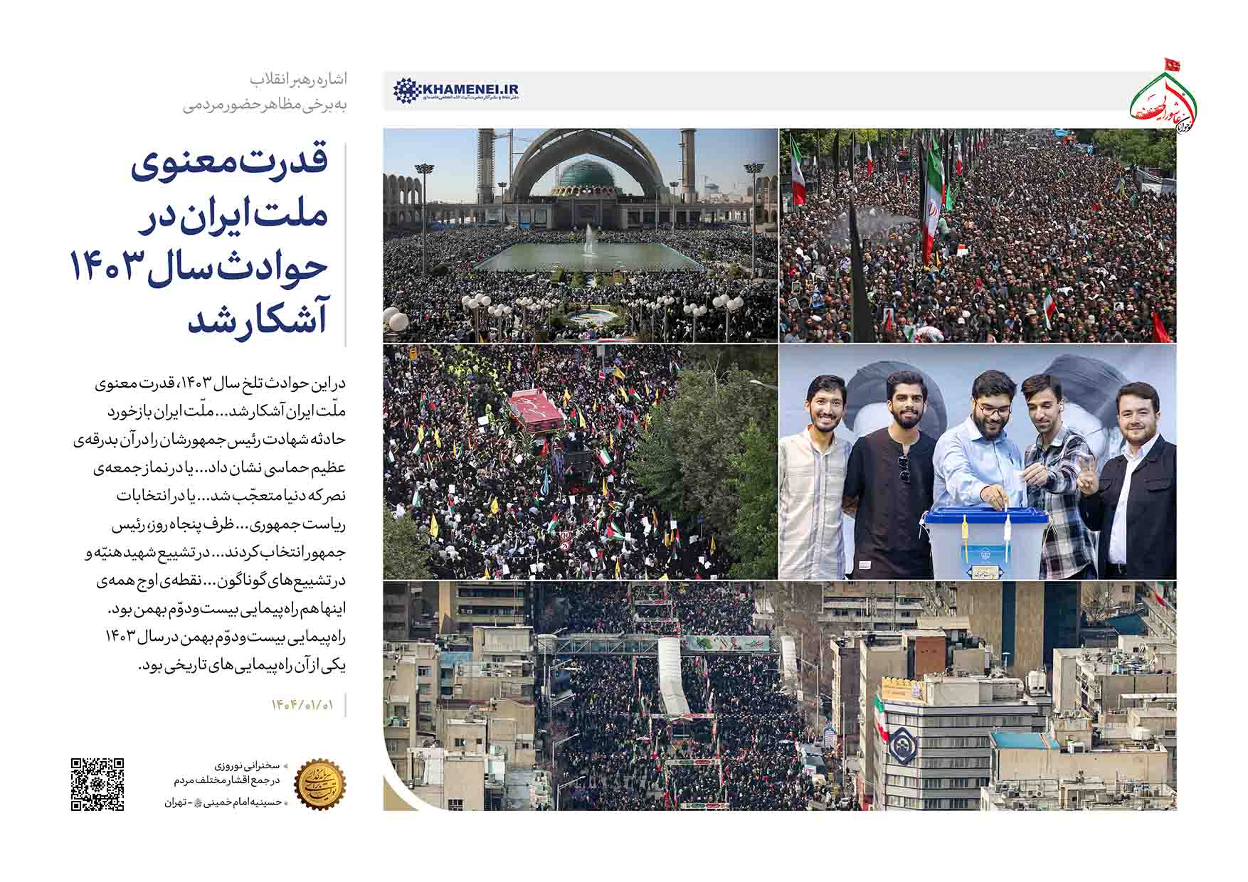 نکتهی مهمّی که دیروز در پیام اوّل تحویل [سال]، به ملّت ایران عرض کردم(۸) و مایلم روی آن نکته تکیه کنم، این است که در این حوادث تلخ سال ۱۴۰۳، قدرت معنوی ملّت ایران آشکار شد؛ صبوری ملّت ایران، ایستادگی ملّت ایران، شهامت ملّت ایران، رشادت ملّت ایران آشکار شد. ملّتها در مقابل حادثهای مثل شهادت رئیسجمهورشان و جمعی از دولتمردانشان کمرشان خم میشود؛ ملّت ایران بازخورد این حادثه را در آن بدرقهی عظیم حماسی نشان داد؛ [یعنی] نمایش عظیم حضور مردم در تشییع جنازهی رئیسجمهور(۹) محبوبشان. یا در نماز جمعهی نصر(۱۰) که دنیا متعجّب شد؛ در همهی کشور آن نماز جمعهی تاریخی اتّفاق افتاد، مردم حضور پیدا کردند. دشمن تهدید میکرد، میخواست ملّت احساس خطر کنند؛ ملّت سینه سپر کردند، آمدند؛ جمعیّتهای کمنظیر. یا در انتخابات ریاست جمهوری،(۱۱) نشاط مردم و آمادگی مردم برای اینکه نگذارند کار کشور زمین بماند؛ در انتخابات شرکت کردند و ظرف پنجاه روز، رئیسجمهور انتخاب کردند، دولت تشکیل دادند. در تشییع شهید هنیّه(۱۲) و در تشییعهای گوناگون، در برخورد با حوادث لبنان و فلسطین و غیر اینها ملّت ایران قدرت معنوی خودش را، روحیهی خودشان را نشان داد؛ نقطهی اوج همهی اینها هم راهپیمایی بیستودوّم بهمن بود. راهپیمایی بیستودوّم بهمن در سال ۱۴۰۳ یکی از آن راهپیماییهای تاریخی بود؛ بعد از ۴۶ سال به یاد انقلابی که آمریکا علیه آن فریاد میکشد، تلاش میکند، اروپا علیه آن تلاش میکند، منافقین عالم، انواع و اقسامشان، گردنکشان، فسّاق، فجّار در هر نقطهی دنیا که هستند و دستشان میرسد علیه جمهوری اسلامی اقدام میکنند، ملّت ایران این حرکت عظیم مردمی را در روز بیستودوّم بهمن انجام میدهد. ملّت ایران خودش را به دنیا شناساند. عزیزان! خودمان هم خودمان را بشناسیم؛ ملّت ایران خودش هم خودش را بشناسد. ما ملّت قویای هستیم، ما ملّت رشیدی هستیم. همهی این مسائل، این رشادت، این حضور، این وارد میدان شدن، در حالی بود که مشکلات اقتصادی هم مردم را احاطه کرده بود؛ اینجور مشکلات اقتصادی معمولاً جمعیّتهای مردمی را ناامید میکند، افسرده میکند؛ مردم ما با همهی این مشکلات وارد میدان شدند، از نظام دفاع کردند. دشمنان نظام به کوری چشمشان دیدند که ملّت ایران به نظام جمهوری اسلامی علاقهمند است.