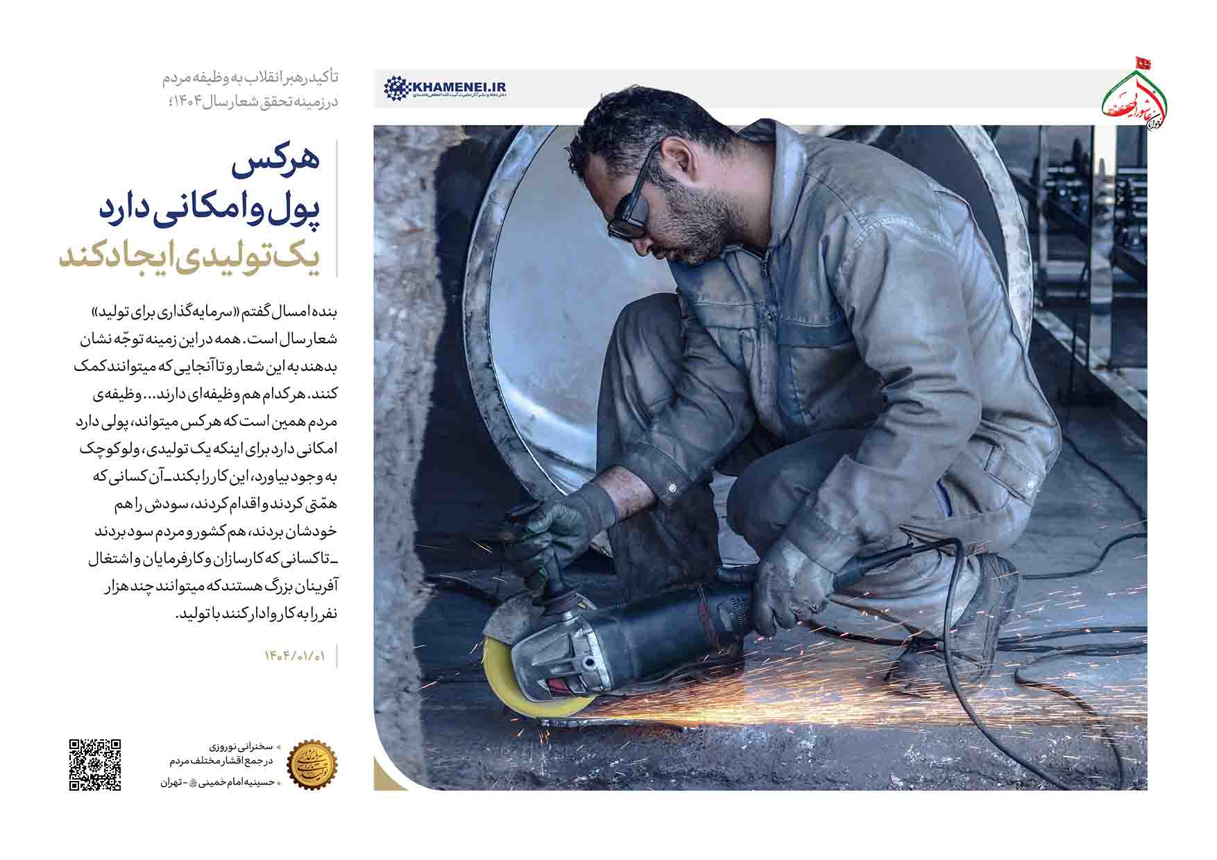 بنده امسال گفتم «سرمایهگذاری برای تولید»، شعار سال است. همه ــ مردم و دولت ــ در این زمینه توجّه نشان بدهند به این شعار و تا آنجایی که میتوانند کمک کنند. هر کدام هم وظیفهای دارند؛ مردم یک وظیفه دارند، دولت یک وظیفه دارد. وظیفهی مردم همین است که هر کس میتواند، پولی دارد، امکانی دارد برای اینکه یک تولیدی، ولو کوچک، به وجود بیاورد، این کار را بکند ــ آن کسانی که همّتی کردند و اقدام کردند، سودش را هم خودشان بردند، هم کشور و مردم سود بردند ــ تا کسانی که کارسازان و کارفرمایان و اشتغالآفرینان بزرگ هستند که میتوانند چند هزار نفر را به کار وادار کنند با تولید؛ همهی اینها [وظیفه دارند]. این مال مردم.