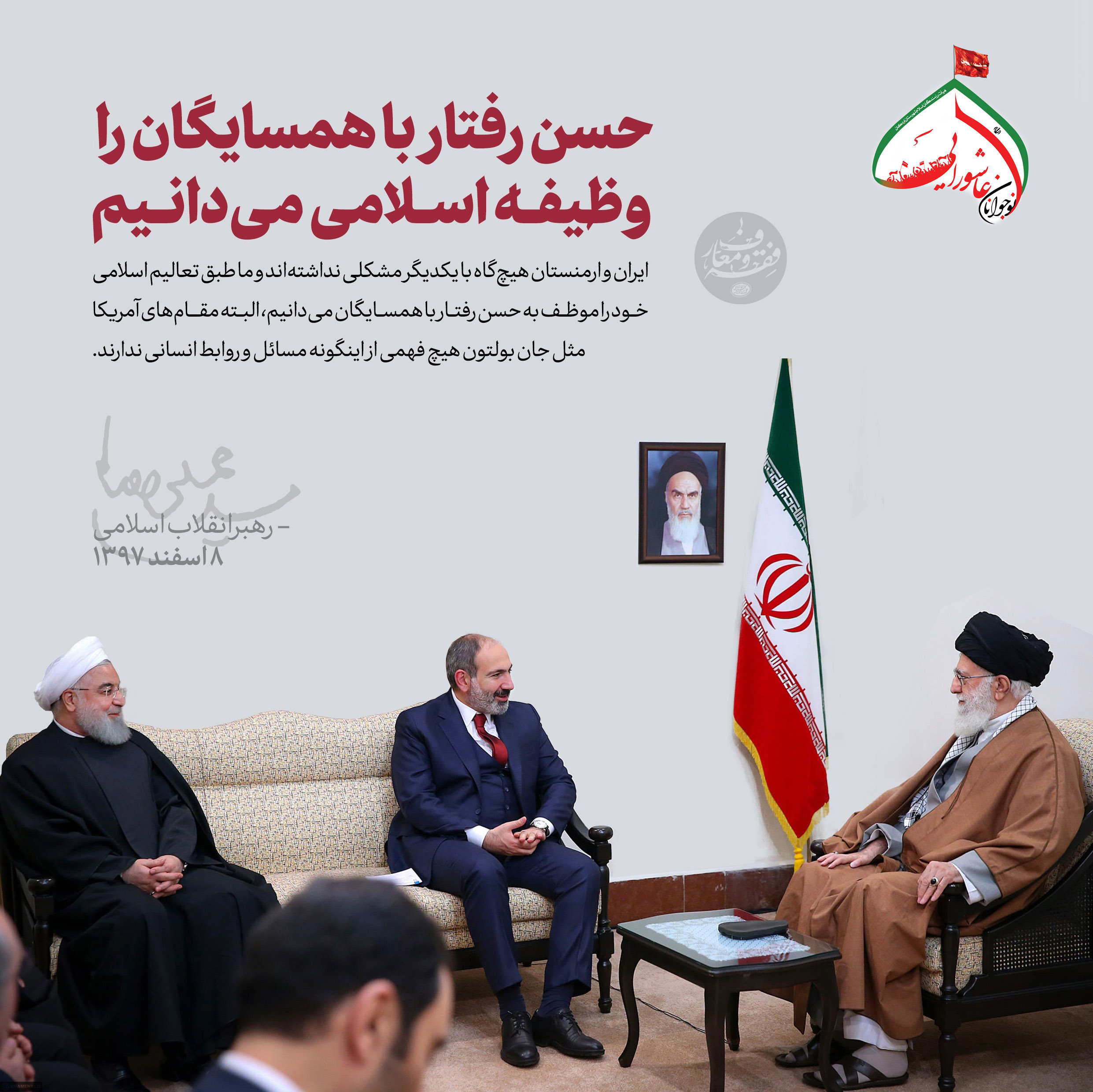 حضرت آیتالله خامنهای رهبر معظم انقلاب اسلامی عصر امروز (چهارشنبه-1397/12/08) در دیدار آقای نیکول پاشینیان نخست وزیر ارمنستان، ایران و ارمنستان را همسایگان خوب و برخوردار از ارتباطات تاریخی خواندند و با تأکید بر لزوم افزایش سطح همکاریهای اقتصادی، خاطرنشان کردند: بر خلاف میل آمریکاییها، روابط ایران و ارمنستان باید مستحکم، مستمر و دوستانه باشد.